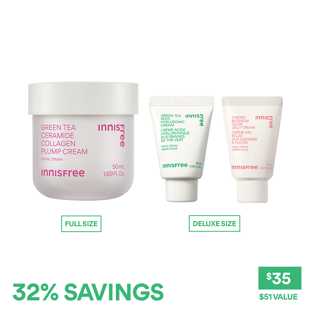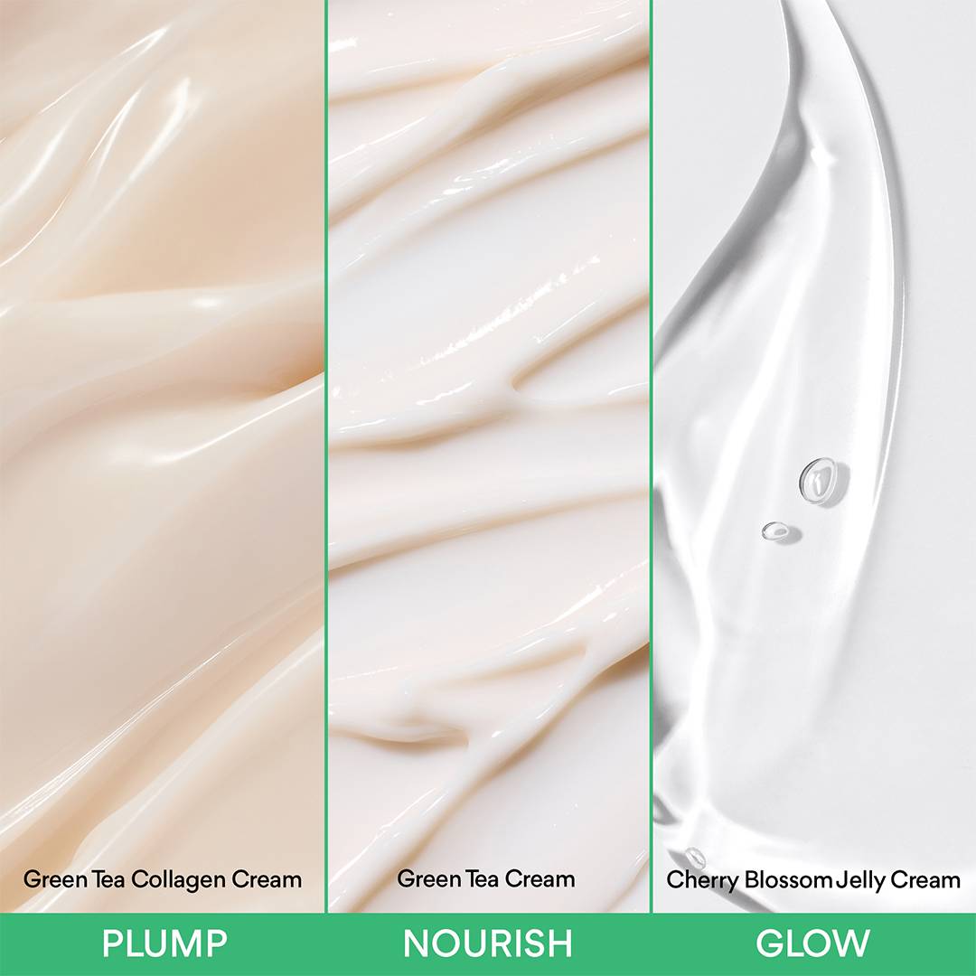 Explore new + cult-fave creams tailored to all skin needs with our Dream Cream Discovery Bundle! Our new Green Tea Ceramide Collagen Plump Cream is clinically proven to improve visibly elasticity by 11% after just 3 days* (and it’s full size!). Dryness your biggest concern? Our holy grail mini Green Tea Cream offers deep hydration while strengthening skin’s barrier. For a cooling effect. try our mini Cherry Blossom Jelly Cream that brightens and soothes. Each cream is ready to tackle your unique concerns and keep your skin glowing through every season.