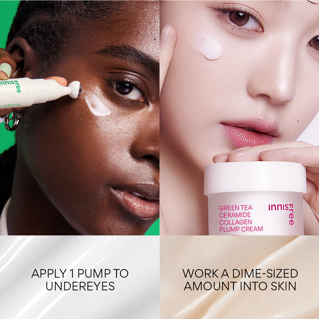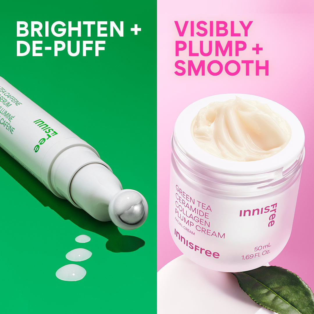 Meet your new go-to duo for plumping skin + de-puffing under eyes. This bundle includes a full size Green Tea Ceramide Collagen Plump Cream and a full size Green Tea Caffeine Bright-Eye Serum. Apply the Green Tea Eye Serum with the metal rollerball to brighten and de-puff tired eyes. Then. apply Green Tea Collagen Cream for visibly bouncy. plump skin.?